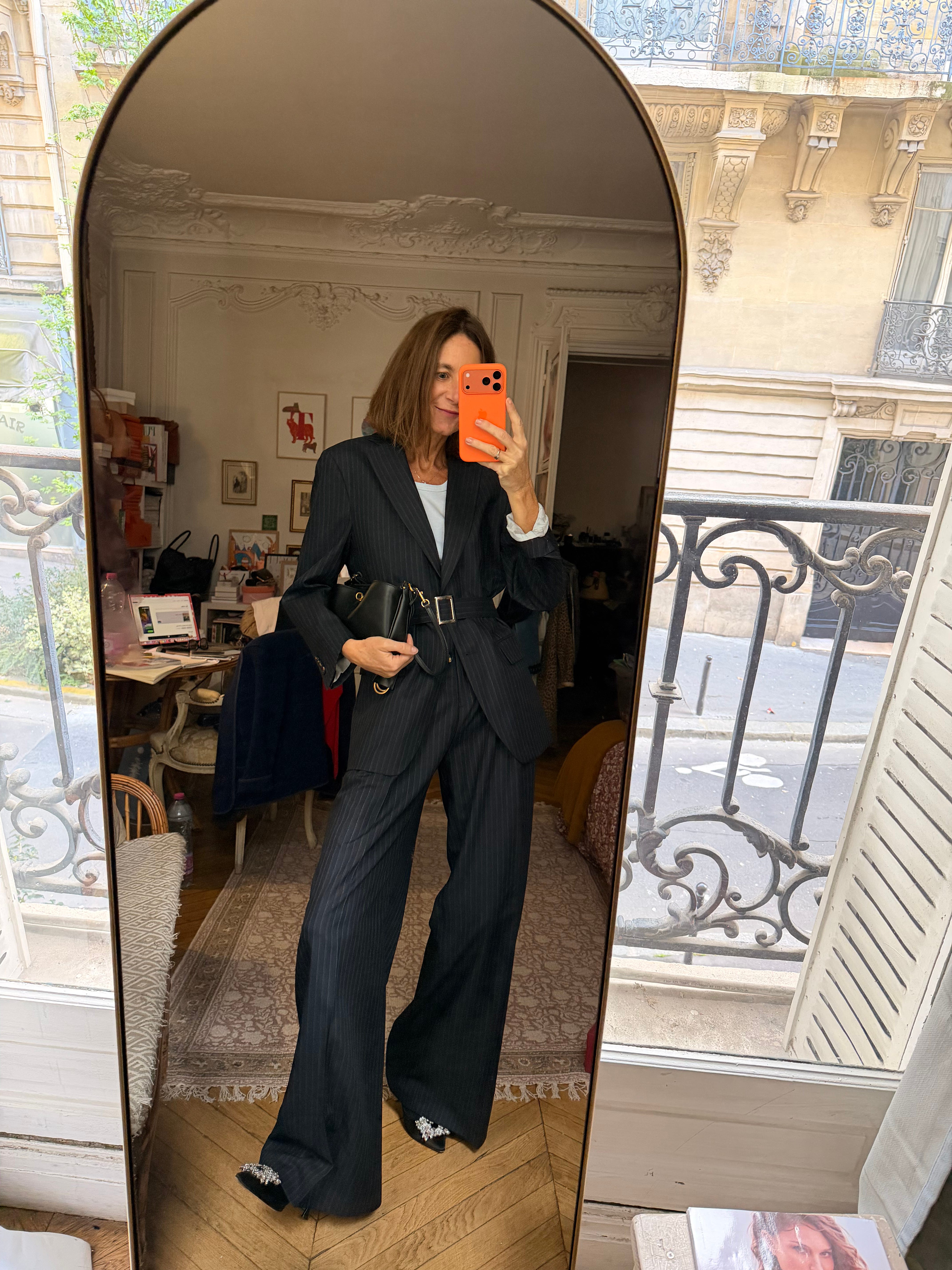 Une veste, un pantalon, un marcel en coton blanc, des escarpins, un micro sac en guise de pochette. Pas de bijoux. La seule fantaisie : une ceinture pour “habiller” la tenue.